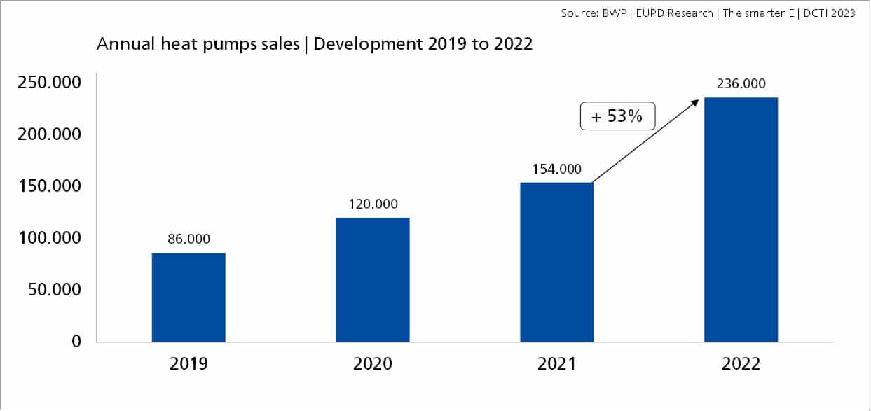 Bonn. In times of permanently rising energy prices, renewable energies are currently experiencing a boom. This is also visible in the heating sector. As a result of high energy prices, and thanks to subsidies for heat pumps, there was a strong increase in heat pump sales in 2022 of around 53 percent compared to the previous year. As a result, sales have increased from 154,000 heat pumps in 2021 to 236,000 heat pumps in 20221.