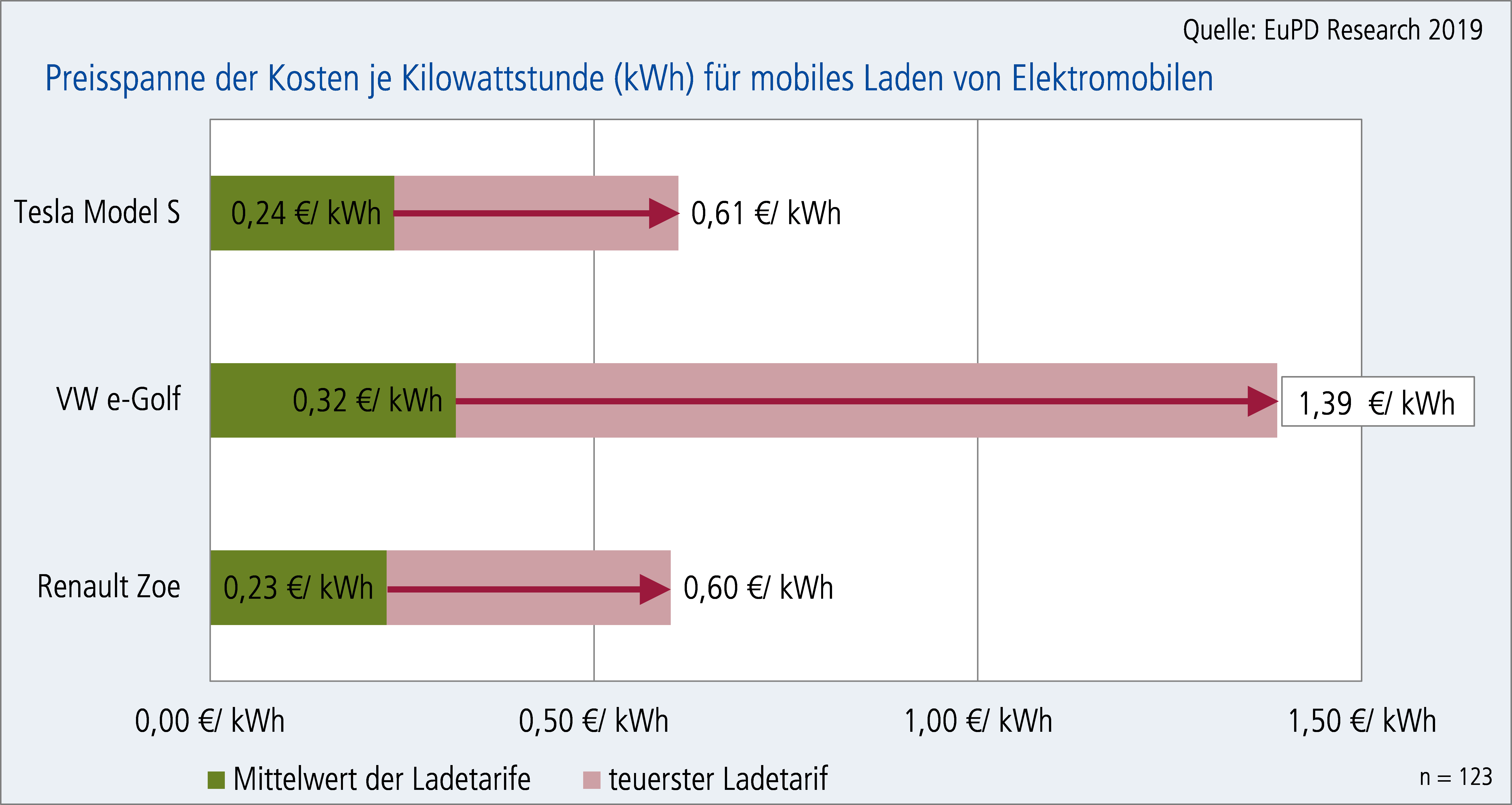 Bonn. Im Rahmen der Studie „Vergleichsanalyse mobiler Ladestromtarife 2019“ wurden erstmalig durch das Bonner Markt- und Wirtschaftsforschungsunternehmen EuPD Research alle in Deutschland verfügbaren 123 Autostromtarife untersucht. Die Studie zeigt einerseits eine sehr vielfältige Landschaft an Angeboten zum mobilen Laden von Elektroautos, andererseits auch eine hohe Intransparenz besonders hinsichtlich der Preise. Zwar fallen die Durchschnittskosten von 23 bis 32 Cent je kWh je nach Automodell eher gering aus, jedoch sind auch im Extremfall Kosten von 60 Cent bis 1,39 € pro kWh möglich. Wenn der Autostrom zudem nach Ladezeit oder Ladevorgängen abgerechnet wird, ist es für den Endkunden nicht auf den ersten Blick ersichtlich wie teuer die Stromladung je kWh ist.
